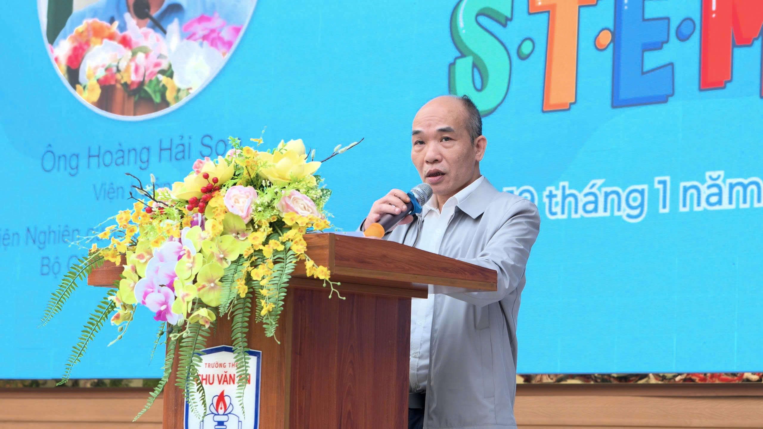 Phát biểu tại buổi lễ, Ông Hoàng Hải Sơn - Viện trưởng Viện Nghiên cứu Thiết kế Trường học khẳng định giáo dục STEM là yêu cầu tất yếu trong bối cảnh chuyển đổi số và đổi mới căn bản, toàn diện giáo dục hiện nay. Cuộc thi “Cùng em sáng tạo STEM 2026” được tổ chức nhằm tạo điều kiện để học sinh vận dụng kiến thức liên môn vào giải quyết các vấn đề thực tiễn, phát triển tư duy khoa học, sáng tạo và năng lực giải quyết vấn đề. Viện trưởng nhấn mạnh chủ đề “Năng lượng bền vững” có ý nghĩa thời sự sâu sắc, góp phần hình thành ý thức trách nhiệm của học sinh đối với môi trường và phát triển bền vững; đồng thời khẳng định vai trò của Viện trong việc định hướng, giám sát chuyên môn, bảo đảm cuộc thi triển khai đúng định hướng và mang lại giá trị giáo dục thiết thực.