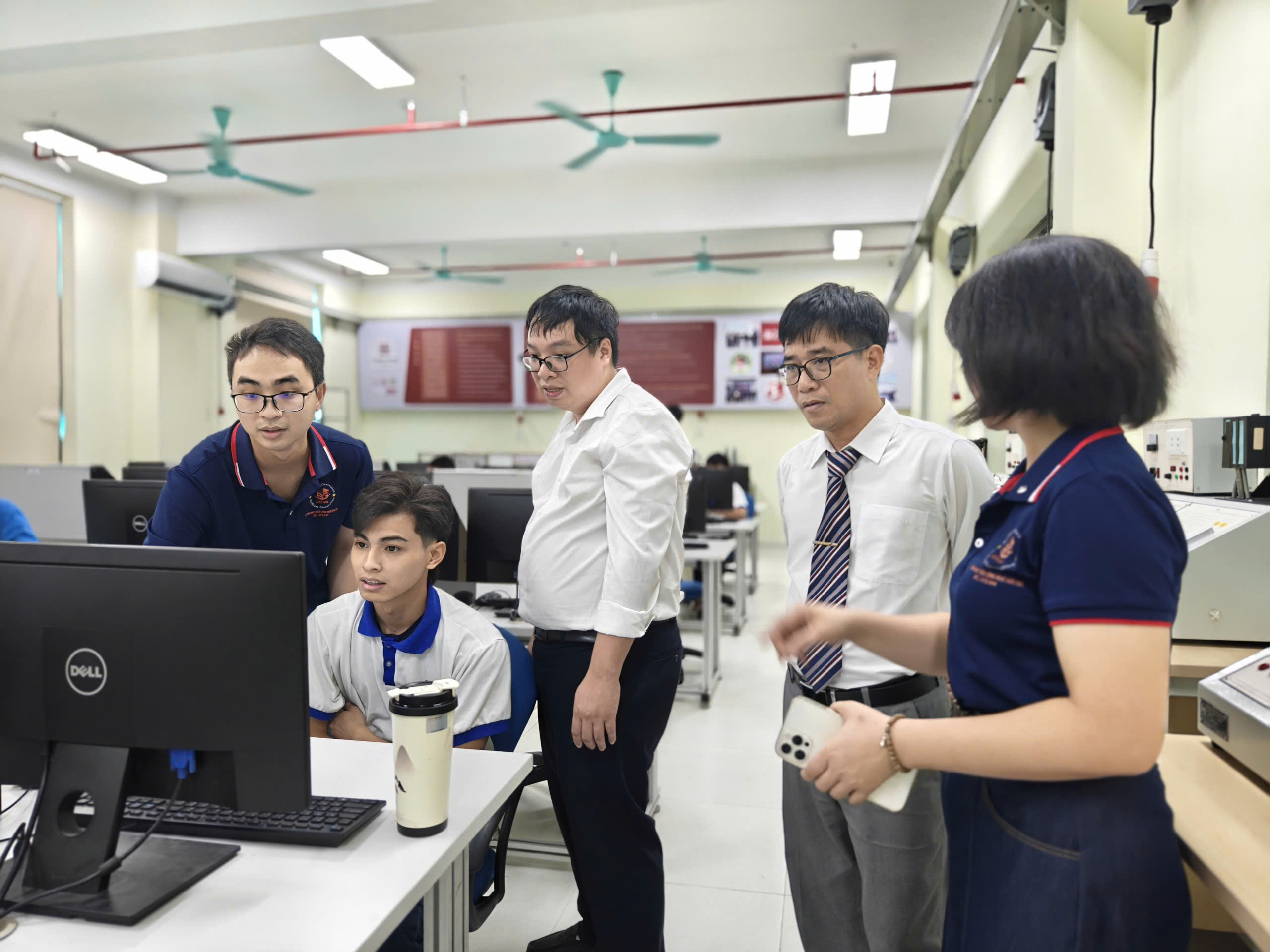Phó Viện trưởng Nguyễn Viết Khiêm cùng các cán bộ Trung tâm Chuyển giao Công nghệ số tham quan & hướng dẫn các bạn sinh viên đăng ký thi và thực hành lập trình thi đấu robot trực tuyến