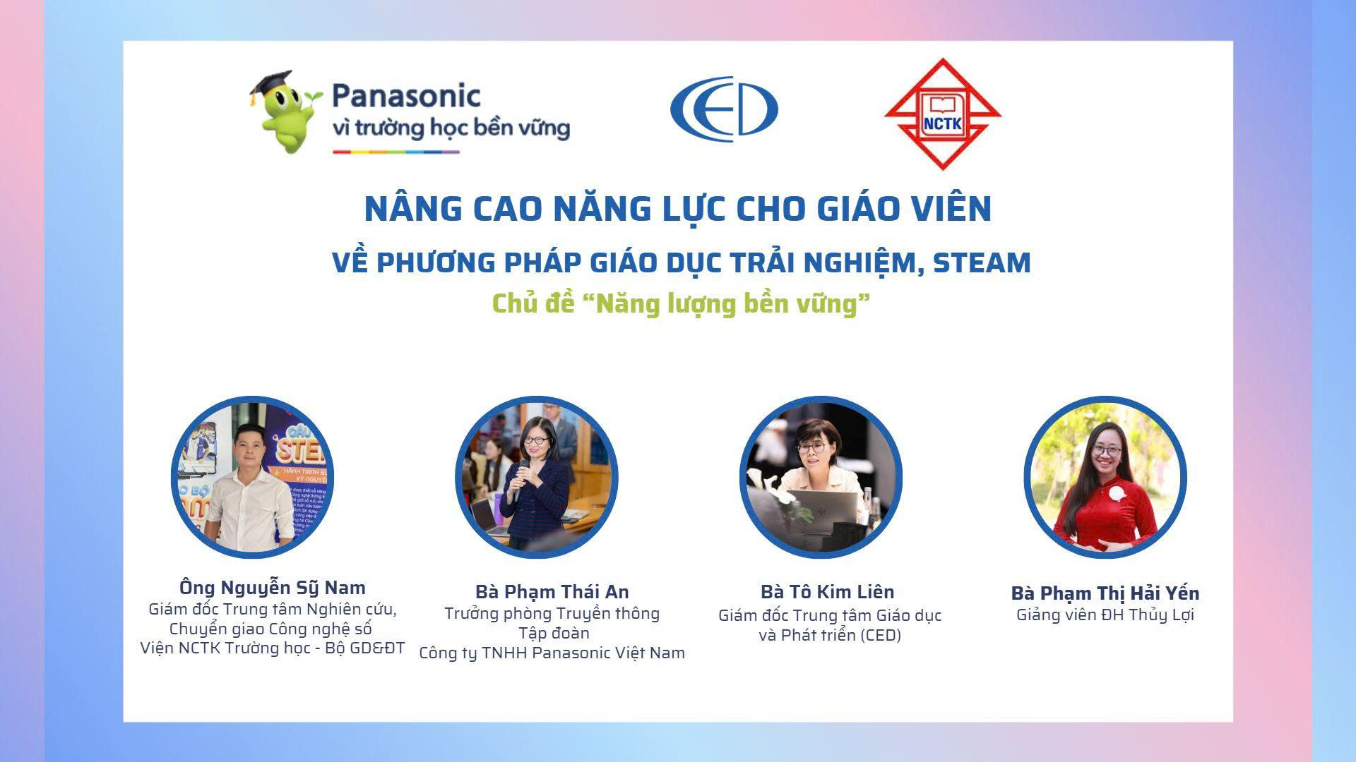 Sáng ngày 20/12/2025, Viện Nghiên cứu Thiết kế Trường học, Bộ Giáo dục và Đào tạo đã phối hợp với Công ty TNHH Panasonic Việt Nam và Trung tâm Giáo dục và Phát triển (CED) tổ chức thành công buổi tập huấn trực tuyến “Nâng cao năng lực cho giáo viên về phương pháp giáo dục trải nghiệm, STEM/STEAM – Chủ đề Năng lượng bền vững”.
