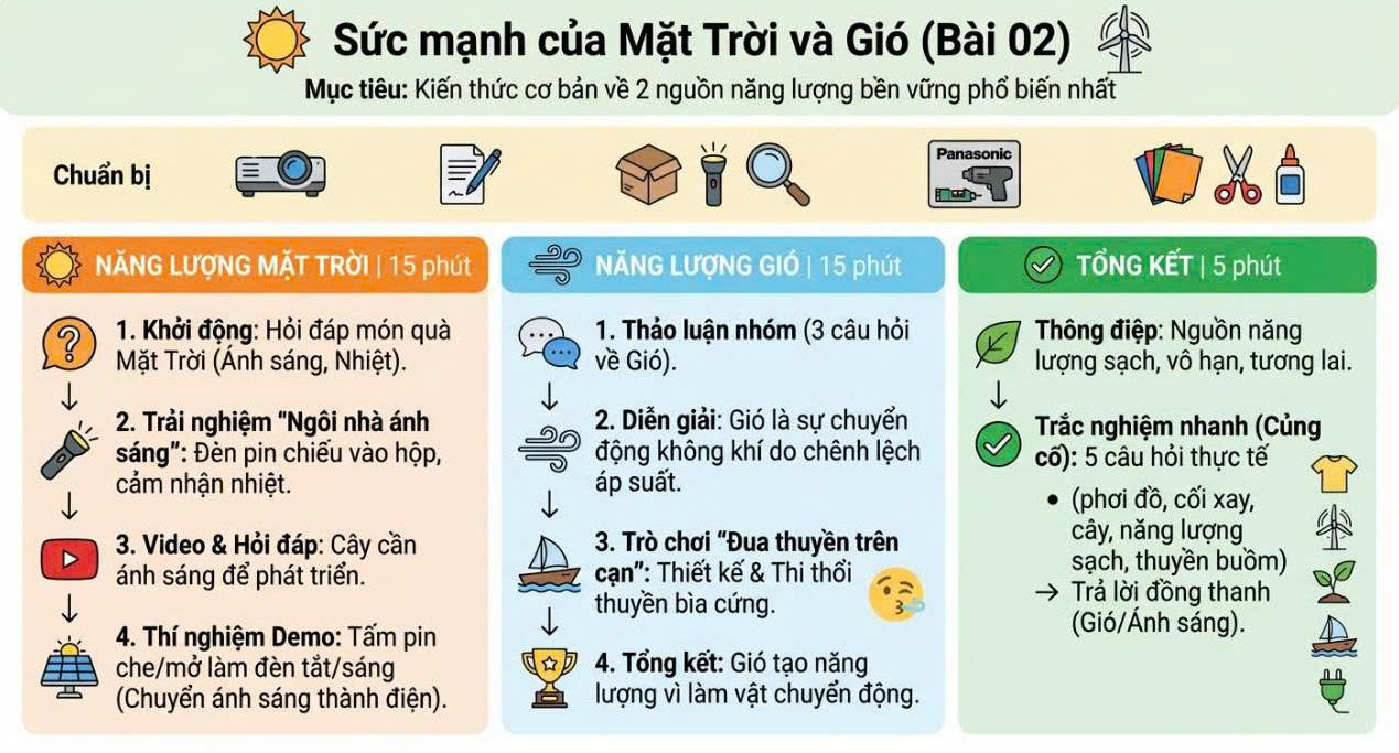 Điểm nhấn nổi bật của buổi tập huấn là hoạt động tìm hiểu và triển khai 5 bài học STEM/STEAM trong bộ tài liệu chủ đề “Năng lượng bền vững” thuộc chương trình “Panasonic vì Trường học Bền vững 2025”. Các nội dung này giúp giáo viên không chỉ nắm được lý thuyết tiếp cận STEM/STEAM, mà còn hiểu rõ cách tổ chức và vận hành trọn vẹn 5 bài học STEM theo chủ đề năng lượng bền vững, phù hợp với điều kiện dạy học tại tiểu học và THCS.